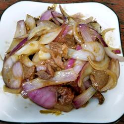 After the onions are soft, pour in the previously fried beef and mix with soy sauce Half a spoonful is useful, and a small half spoonful of salt, stir-fry until the flavor is absorbed, and then serve.