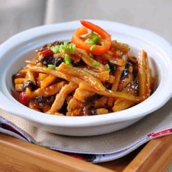 2. Cut the bamboo shoots into shreds and boil them in water for 6 minutes, and cut the fungus into shreds.Cut the tenderloin into shreds, marinate with half an egg white, one teaspoon of pepper, and three teaspoons of cooking oil for ten minutes.Remove all seasonings from water and starch and mix into juice.Mince the onion, ginger, garlic, mince the pepper, and mix with the bean paste.