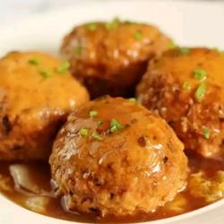 11. Place the baby cabbage on a plate, place the meatballs on top, and pour in the thickened gravy of soup, sprinkle with chopped green onion.