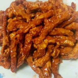 4. Heat the oil until 80% hot, hang the battered meat strips underneath, fry until golden brown, remove and set aside.