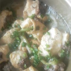 5. At this time, clean the cooking pot, heat it up and add some oil.Crush the washed onions and green onions, put them into the pot and stir-fry, then use a bowl Take half a bowl of water, add an appropriate amount of salt and light soy sauce, mix well with chopsticks, pour it into the pot with fried onions and bring to a boil, then pour it into a casserole and cook it.The longer you cook the tofu, the better it tastes! However, Be careful not to cook it too dry, but to have a little juice.At this time, use a bowl to collect a little water, add a small amount of cornstarch, mix well, pour it into the tofu, bring to a boil, sprinkle with chopped green onion, and it is ready to eat