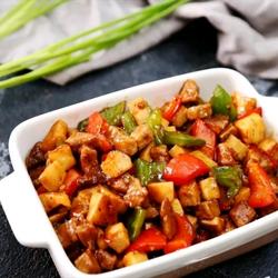 6.Add green and red peppers, stir-fry until they change color slightly, then set aside.