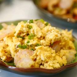 8. When the egg liquid is almost solidified, add the fried shrimps and stir-fry evenly..