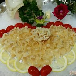 9. When loading the plate, place the crushed ice base at the lower position of the plate Place a semi-circle piece of tin foil.(Lemon slices are placed in a semi-circle along the edge.) First place large pieces and press them one by one so that there will be a sense of hierarchy.Make a semicircle, leave a space in the middle, and arrange the clam slices along the circle toward the meat to form a flower