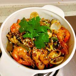 9. Stir-fry twice and put on a plate, then sprinkle with sesame seeds and coriander, spicy and fresh Fragrant, spicy seafood hotpot is completed٩(˃̶͈̀௰˂̶͈́)و