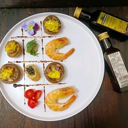 5.In another pot, add appropriate amount of olive oil.Mushrooms and two prawns left in the refrigerator,