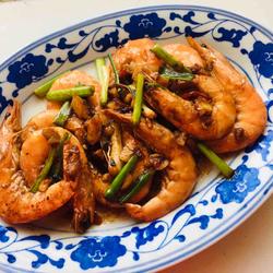 3. Heat oil in a wok, add shrimp and fry until golden brown on both sides, add Fry the minced garlic until fragrant, then add a little sugar, light soy sauce and oyster sauce.