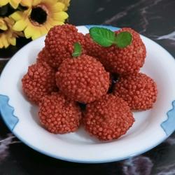 9. Use a stainless steel spoon to dip some rice wine and cut out the size of a lychee.Shrimp paste, wrapped in crispy flower particles, all wrapped
