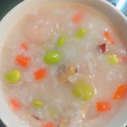 6.Put oil in the pot and stir-fry the seafood.Remove the seafood and leave the soup.Add rice and water to a boil, add edamame, carrots, and cook over low heat until thick porridge is formed, then add stir-fried seafood, bring to a boil, and adjust the taste accordingly