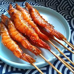 3. Put the prawns on bamboo skewers and adjust them before brushing Dipping sauce