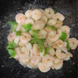 3. Add oil and stir-fry onion and garlic until flavourful.Stir-fry the shrimps over medium heat, add green pepper, salt and MSG.If the pan is sticky, put a small bowl of water, simmer over low heat for a while, and remove from the pan