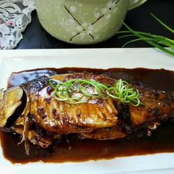 12.Put it on a plate, add shredded green onion rolls, and take a picture of the finished product.A plate of delicious braised crucian carp is complete