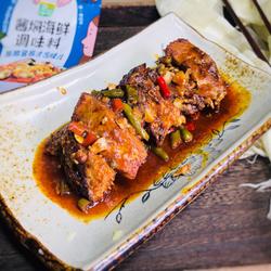 4.Turn over and fry until both sides are golden brown.Add ginger, garlic, peppercorns, green and red chili peppers, and stir-fry to create a spicy flavor