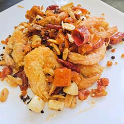 5. Heat a little oil in a clean pot, add ginger, garlic, Sichuan peppercorns, and dried chili peppers in sequence.Stir-fry the green onions until fragrant, add the spicy crisps and stir-fry until fragrant, add the shrimps, add salt, MSG, chicken essence and sugar, stir-fry evenly and remove from the pan.