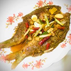 5. Put all the fried fish into the pot, add the green onions and ginger slices , garlic cloves, dried chili segments, salt, and sugar.