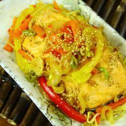 10.Add the prepared sauce and bring to a boil, add bean sprouts and colored peppers and stir-fry.