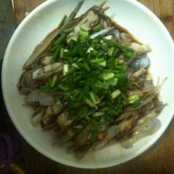 1. Boil the fresh razor clams in boiling water for half an hour and remove., place on a plate, pour in the prepared sauce, and sprinkle with chopped green onion