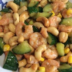 10.Put the freshly fried shrimps Take it out, add cucumber and corn, add a little oyster sauce, salt, and sugar and stir-fry