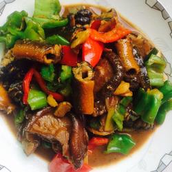 7.For about ten minutes, open the lid and stir-fry for a few times.Add the green and red peppers