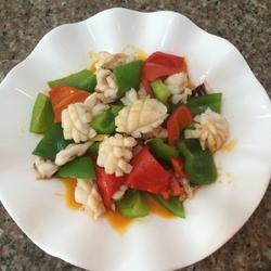 4. Heat the oil pan, sauté the ginger and garlic, and add the chopped green and red peppers and stir-fry fragrant.Add squid and fry together for 2 minutes.