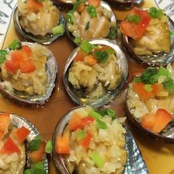 13.Sprinkle red pepper or red and green pepper and chopped green onion on the surface of the abalone after it is cooked