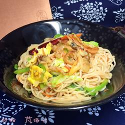 Soak the dried seafood in advance and cut the vegetables into thin strips.You can replace it with your favorite fresh vegetables.Stir-fry vegetables until cooked for 8 minutes and add rice noodles.Keep it on medium heat.