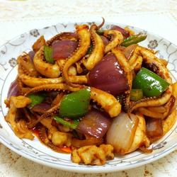 10. After the squid tentacles are fragrant, add the fried onions and stir-fry quickly, add Appropriate amount of light soy sauce to enhance the freshness.