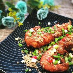 8. Fry until the shrimp shells are crispy, remove and serve on a plate.Sprinkle reserved bread crumbs, salt and pepper powder, chopped green onions, and millet pepper rings