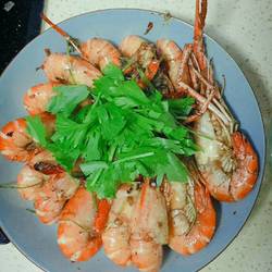 4. After the auxiliary ingredients are fragrant, stir-fry the fried shrimps, oil and seafood soy sauce