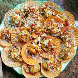 9. Then put the marinated scallop meat back into the shell and sprinkle it on Garlic and chili, if you like it more fragrant, you can fry the garlic and sprinkle it on when the scallops are almost cooked