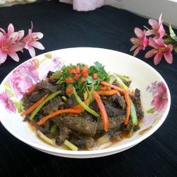 8. Add green and red peppers, stir-fry until cooked, remove from the pan and drizzle some sesame oil.