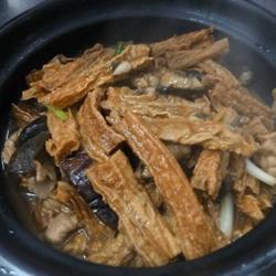 4. Fry the eel until fragrant, add the head, add water, season, and finally Put the yuba, turn on medium-low heat, simmer for about 10 minutes, thicken the gravy to collect the juice, and add the green onion
