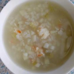5.In the pot, put two handfuls of washed rice, chopped sweet potato cubes, then add appropriate amount of salt, pepper, sesame oil, then add shrimp cubes, bring to a boil over high heat.Simmer over low heat for 40 minutes