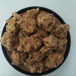 9. When the oil is 60 to 70% hot, start frying the meatballs.Squeeze out a small ball with your left hand.Use a spoon or chopsticks to remove the small ball with your right hand.Put it into the oil pan and repeat.Repeat this step until the batter is finished