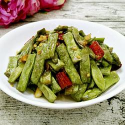 The green beans are blanched in water and then stir-fried.The result is less oily and softer.MSG can be added according to personal taste.