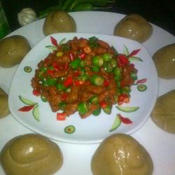 3.Spicy cut Dice the meat, add salt and MSG, stir-fry the chopped green onions and set aside.Serve with steamed buns