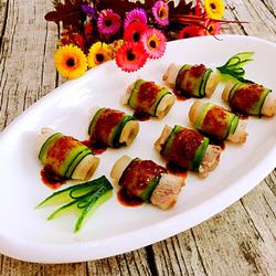 11. Use long slices of cucumber to roll up the pork belly and place them on the plate one by one, evenly Pour on the sauce