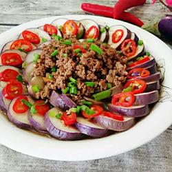 After steaming the minced meat and eggplant, be sure to pour out the soup evenly In*, eggplant tastes better.