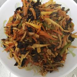 7. Add carrots, spring bamboo shoots, fungus and pepper and stir-fry