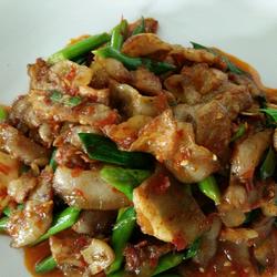 4. Leave the base oil, stir-fry ginger and garlic slices, watercress, bad chili pepper, stir-fry until fragrant, put back the braised pork, garlic sprouts,