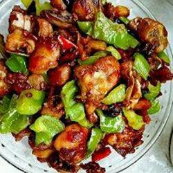 7.Add chicken pieces, add scallions, green pepper, and pepper and stir-fry
