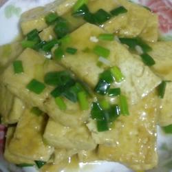 2. Leave the oil in the pot and sauté the green onion.Add the fried tofu, add water, mince the tofu, add salt, soy sauce and chicken essence and cook for about 20 minutes so that it tastes delicious