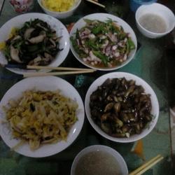 How to make four dishes (mushrooms, green vegetables, steamed eggplant, baby cabbage, fried octopus with green pepper)
