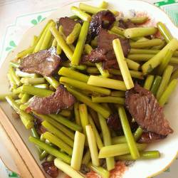 5. Heat the oil in the pot and fry the bacon, then add the green onion and ginger to the pot, then add the garlic sprouts and stir-fry, add a little soy sauce, if you feel it is not salty, you can add some salt, stir-fry a little and take it out of the pot!