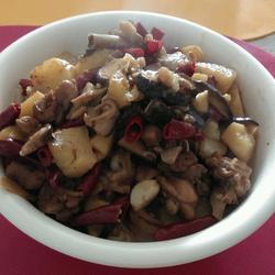 1. Prepare all the ingredients, peel the chicken legs and cut them into small pieces, cut the potatoes into hob pieces, cut the green onions into inch sections, slice the ginger, cut the peppers into small pieces, and cut the mushrooms pieces, no need to cut the garlic.