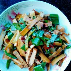 5. Heat the pan, add a small amount of oil, pour in the pork belly and stir-fry until it curls Add bean paste and stir-fry, then add garlic and ginger in turn and stir-fry.When the aroma comes out, stir-fry the green pepper, then add the dried tofu.Stir-fry for a few minutes, add garlic sprouts, add chicken essence, and heat up the pot~