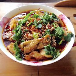 13.fish Remove from pot and plate, add pepper noodles, white sesame seeds, chives, and peppercorns