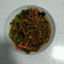 5. Then put oil in the pot and stir-fry the submerged meat.When it turns white, take it out, add soybean paste to the remaining oil in the pot, stir-fry until red, add garlic, onion and ginger, regenerate soy sauce, dark soy sauce, salt, sugar, vinegar, pour in the starch water prepared earlier, stir-fry and then add the meat.Shredded bamboo shoots, carrots, fungus and green pepper strips, stir-fry for two minutes and then serve!