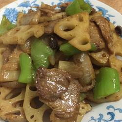 7.Add lotus root slices and pepper cubes and stir-fry until cooked.If the taste is heavy, you can add a little salt