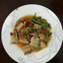 4.When the pork is almost cooked, add celery and chopped pepper, stir-fry evenly, add soy sauce and a little salt, because the chopped pepper contains salt